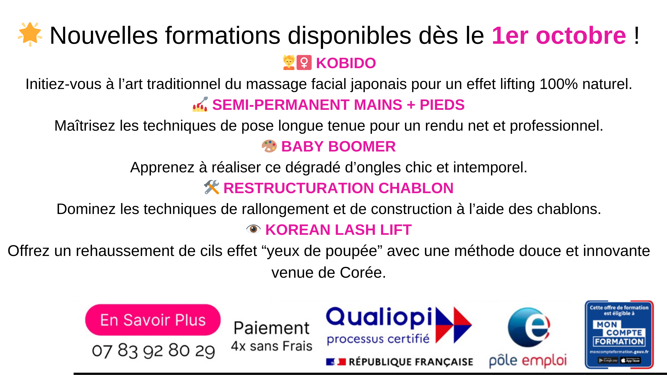 • Remise du certificat par votre formatrice certifiée avec expérience de 12 ans dans l’esthétique.