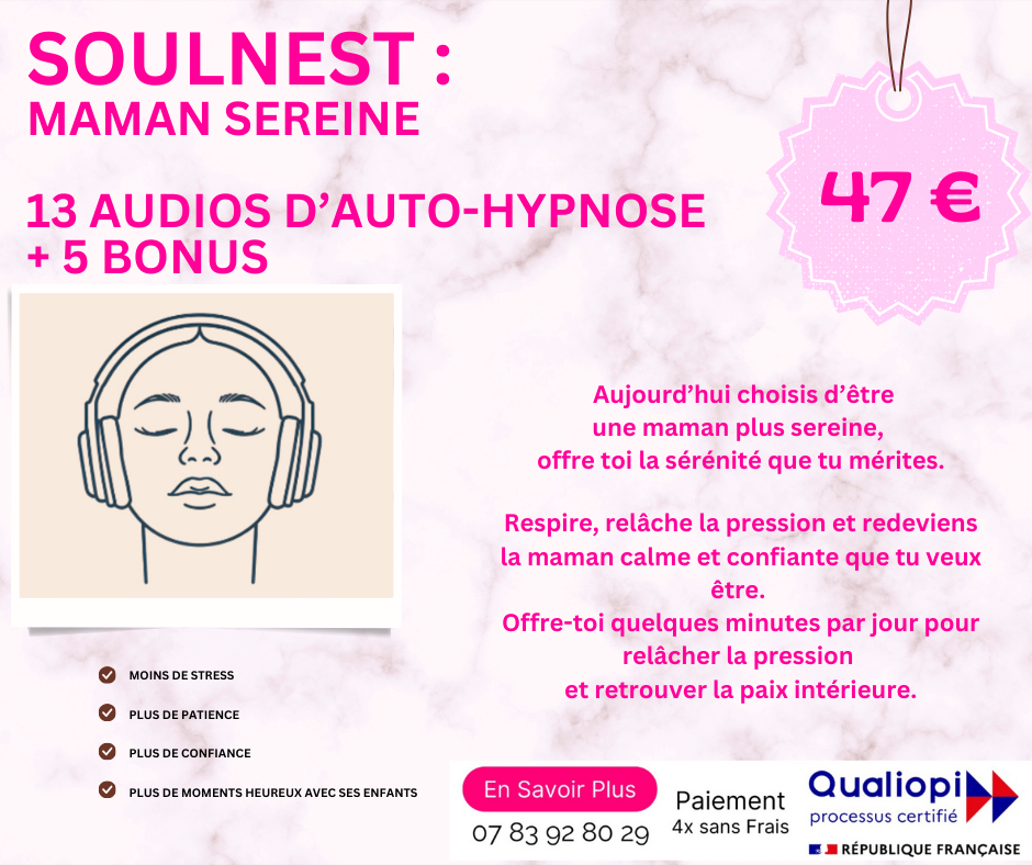 Ensemble, nous avons créé cet espace d’auto-hypnose pour aider les mamans à apaiser la charge mentale et choisir plus de sérénité au quotidien.