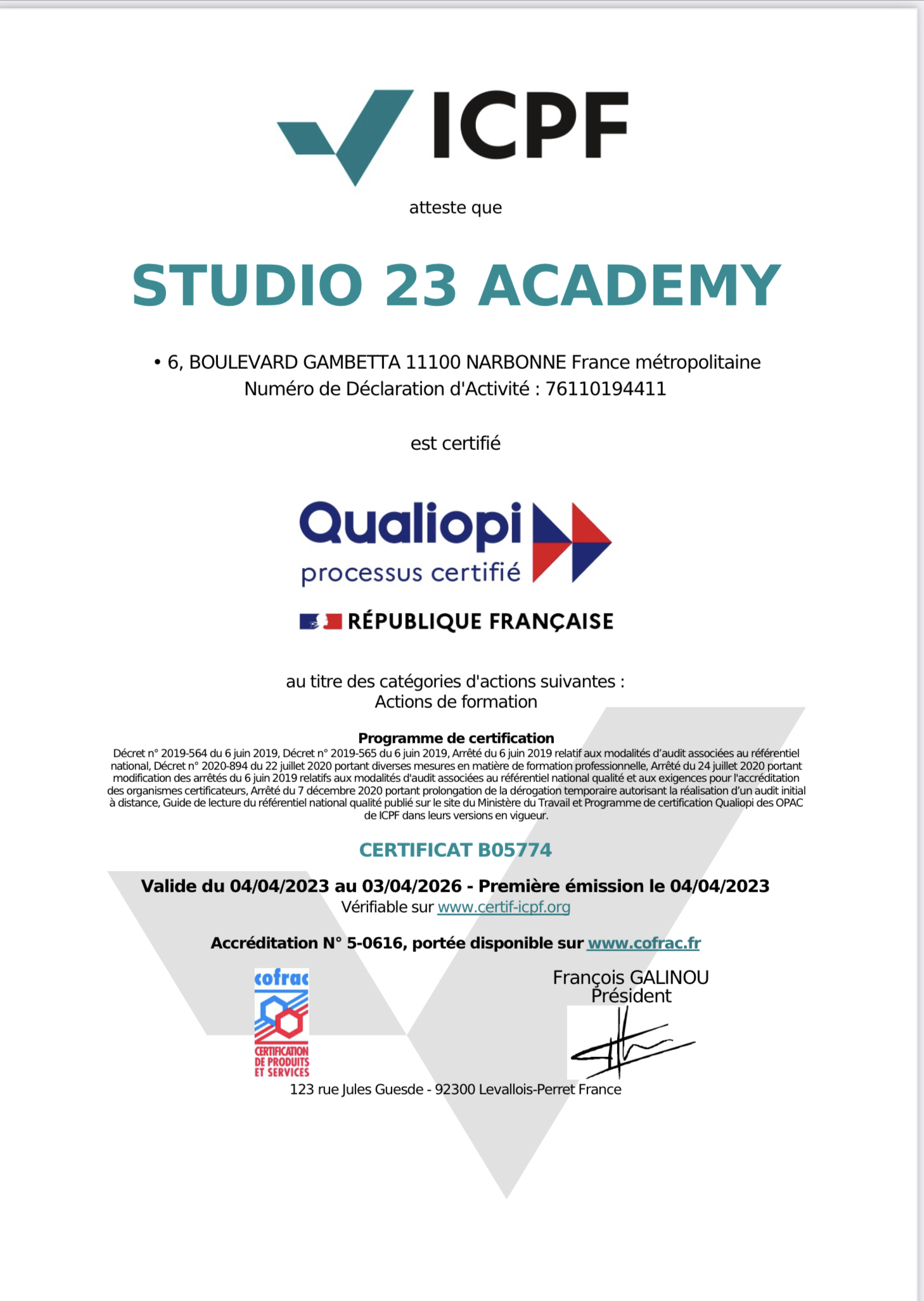 Certifié QUALIOPI par l’organisme ICPF CERTIFICAT B05774